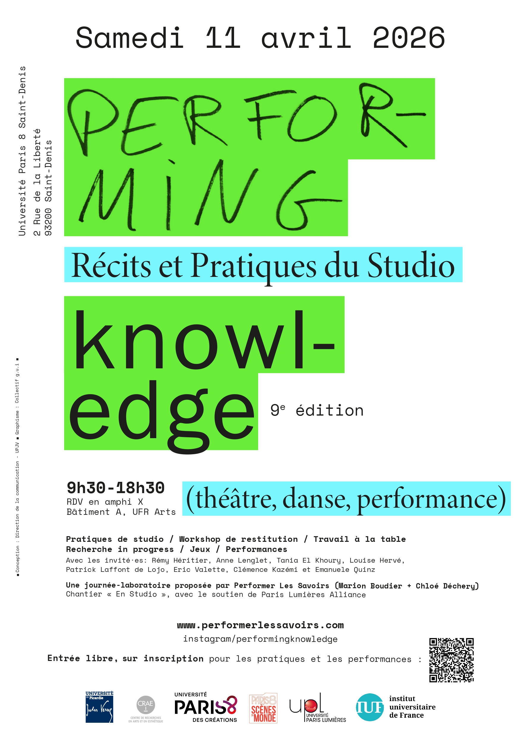 Chloé Déchery et Marion Boudier ont le plaisir de vous inviter à la prochaine journée-laboratoire du programme Performer Les Savoirs, sur les “Récits et pratiques du studio”, qui aura lieu le samedi 11 avril, à l’Université de Paris 8 Saint-Denis, de 9h30h-18h30.